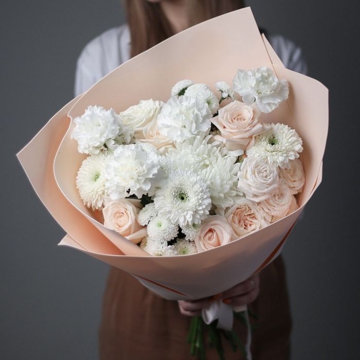 Воздушный микс из роз, гвоздик и хризантем в пастельной гамме напоминает утренний свет через тюль. Бутоны разной степени раскрытия создают объёмную текстуру, а мягкие оттенки перетекают один в другой без резких границ.